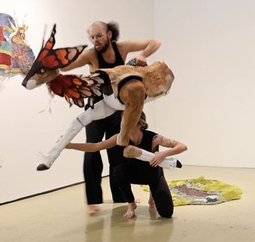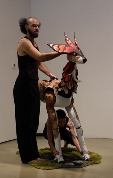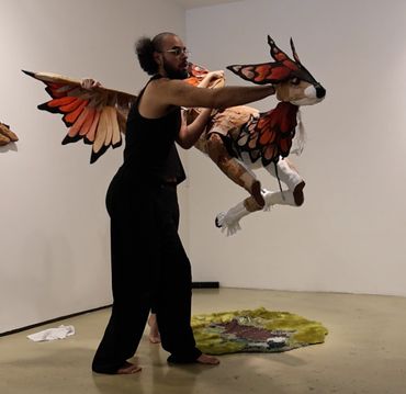 For Sport or For Beauty illustrates the relationship between people with marginalized identities and the anxiety-informed “prey mentality.” This performance follows a youthful deer as it learns that there are people in this world who are out to get it. Adopting a lifestyle of fleeing in response to that truth, the deer realises that their self defense mechanism actually enforces the threats of fear and acts on behalf of an unseen oppressor. The deer is struck by a car, killing the fearful body but not the newly-liberated spirit. This introspection sparks a revelation and metamorphosis into a creature much for fantastical and free.