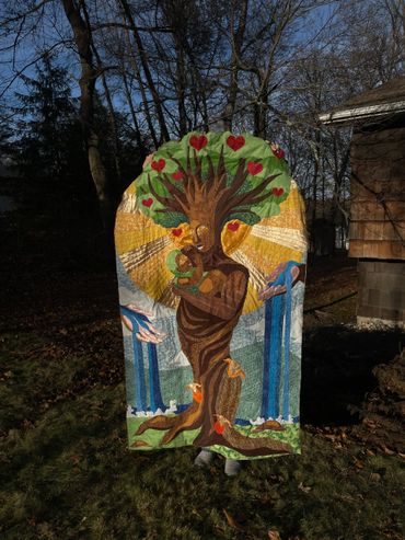 Safe In My Mother’s Arms is an illustrative quilt that celebrates the relationship between a mother, her child, and their community as they care for one another. Whether it’s a mother nurturing her children or a community nurturing their own, mothers and motherhood are an integral part of growing and maintaining community and culture. This piece specifically speaks to mothers that haven’t had a linear journey but have sought out and received support from those around them in order to provide for themselves and their children.