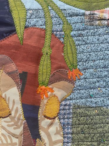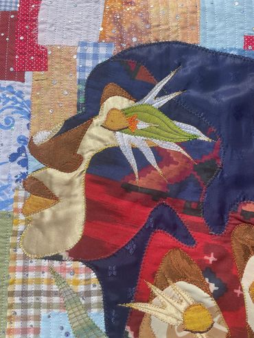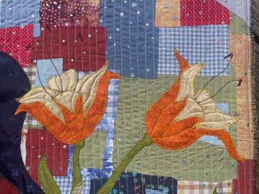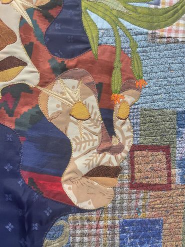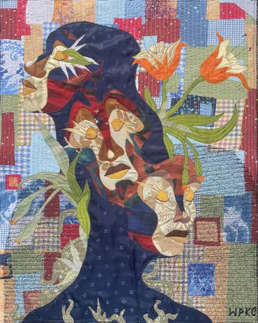 The three faces of this figure (right to left) represent feeling stuck and lost in one’s patterns, acceptance and dedication to growth and change, and the freedom, light, and hope that comes with progress. Orange lilies, representing a newfound understanding of one’s identity in my work, grow from and around the figure, appearing dried and brambly at the bottom while getting increasingly more vibrant as they grow upwards. Buds hang within the figure’s field of view as a promise of flowers in the future, and light beams shine from the eyes of all the faces because hope was always present in every step of this journey, even if it couldn’t be seen.